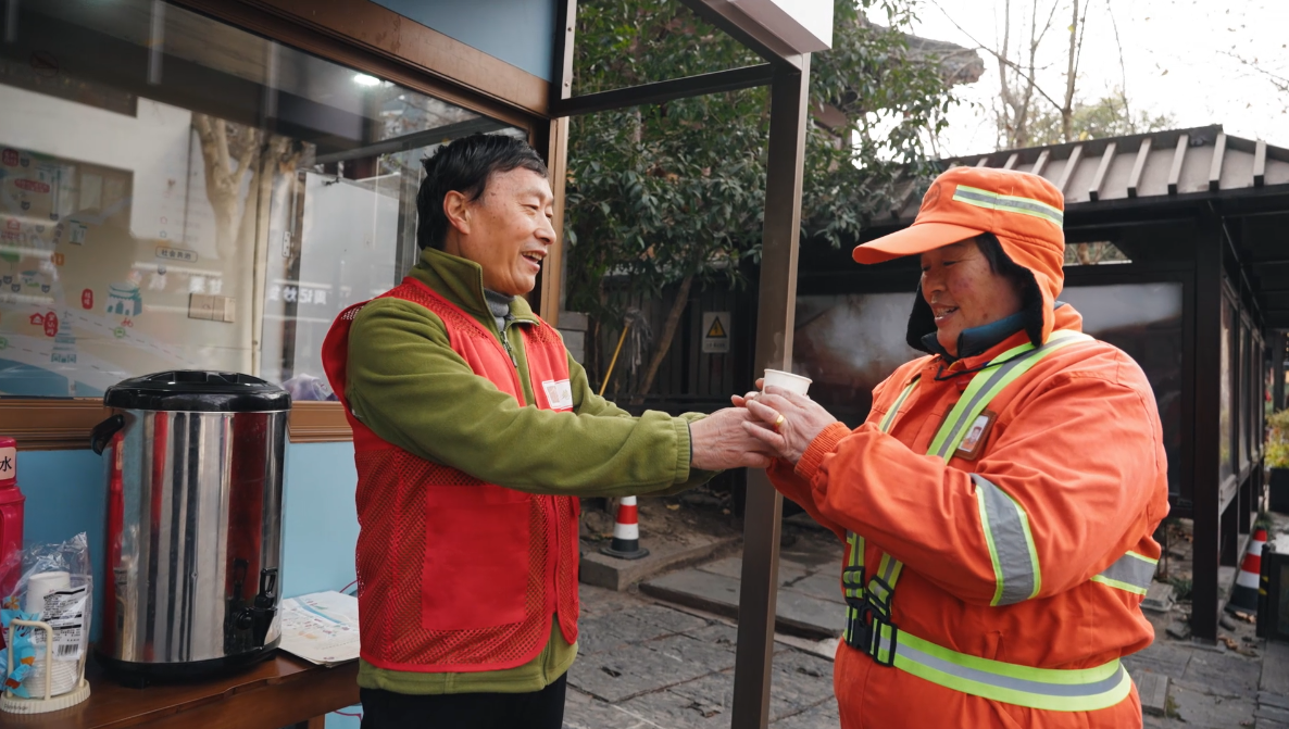 游客杜女士第一次来杭州,找不到想去的饭馆,闻桂贤一指路,她很快就到了。“很开心有人能帮我们。”游客小高接过那杯大麦茶时,杭州刚好下过雪,她说:“志愿者默默传递着这座城市的温度。有他们在,对我们外地游客来说,特别温暖。”