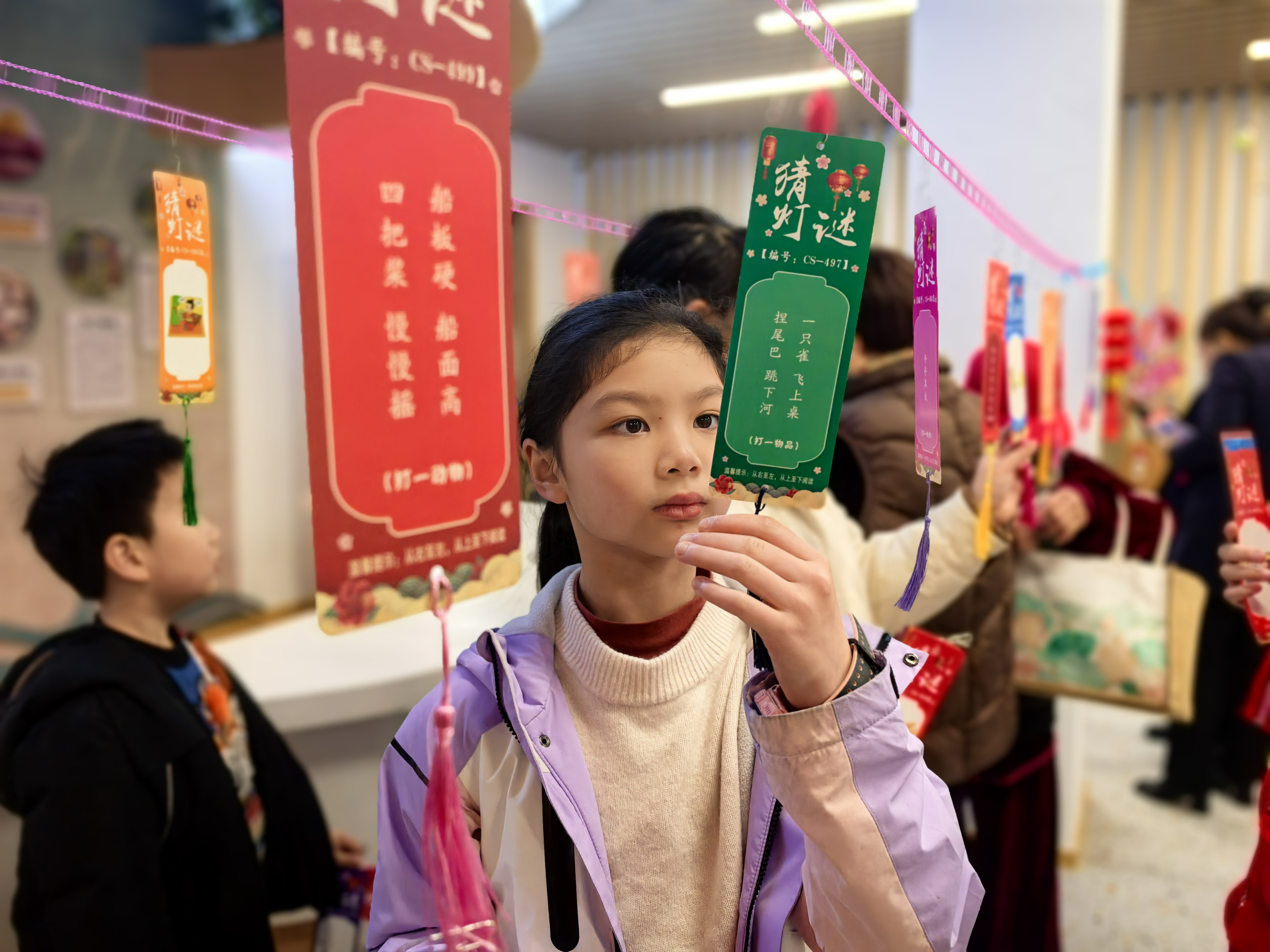 活动现场人气爆棚,节日特色活动精彩纷呈。手工灯笼DIY区域热闹非凡,穿线、糊纸、贴花、挂穗,一盏盏形态各异的元宵灯笼在孩子们手中蹦蹦跳跳。除了传统民俗体验,灯谜区人气超旺,大家争相抢答元宵民俗、传统文化相关题目。“孩子既能动手做灯笼、猜灯谜,还用压岁钱买到了喜爱的图书,活动很不错。”和孙子一同猜灯谜的居民王阿姨笑着说。