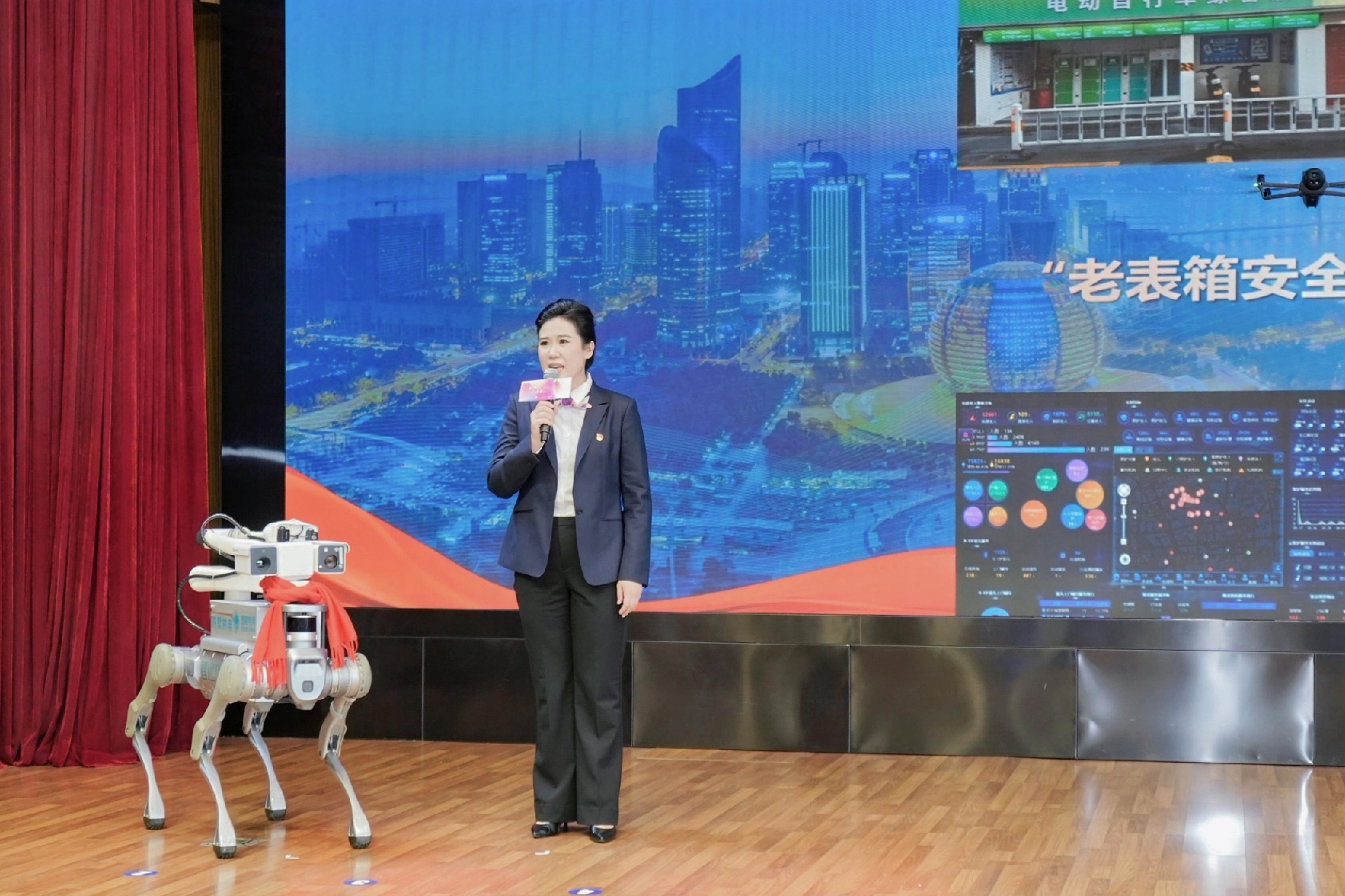 随后,拱墅供电公司城北高压班副班长许睿颖带来《柔肩扛光明 智改惠民生——浙工新村背后的电力“她力量”》宣讲,讲述她在老旧小区改造中带领团队攻坚克难的故事。令人眼前一亮的是,宣讲过程中,机器人、机器狗和无人机齐上阵——机器狗灵活地模拟电力巡检操作,机器人迈着稳健步伐现场互动,无人机则在会场低空盘旋,实时传输画面,将电力智能化改造的场景生动呈现在观众眼前。这些智能设备不仅展示了电力行业的前沿科技,更让宣讲变得“可看、可触、可感”,成为AI助力宣讲手段的创新尝试。