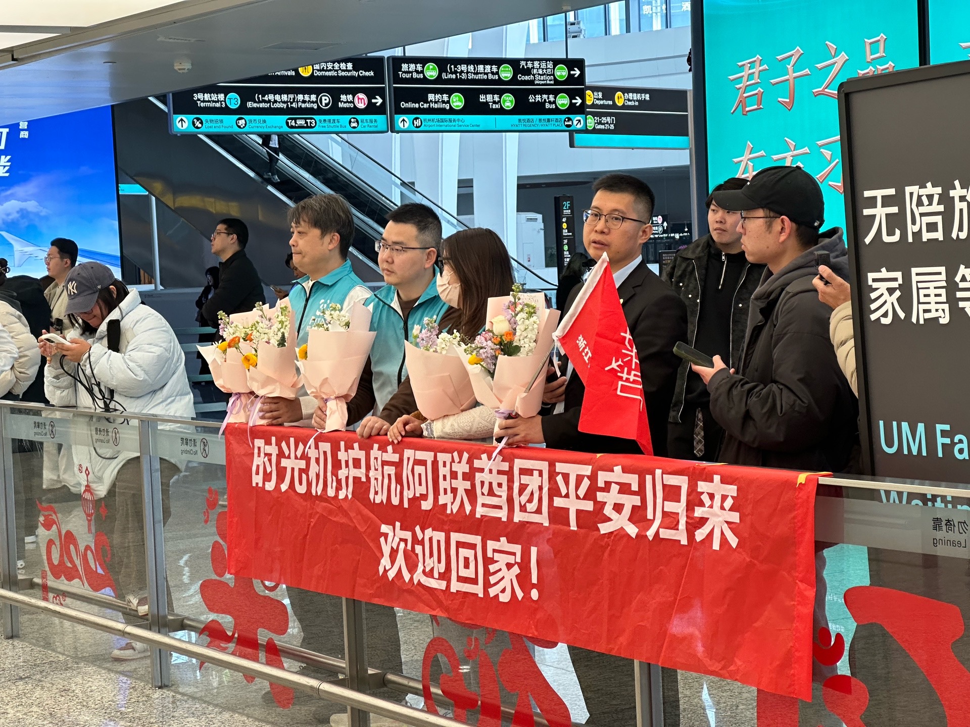 从事投资行业的杭州人陈辰,抵达航站楼到达大厅,看到一众人迎接他们的到来时,眼角不禁泛起了红色。