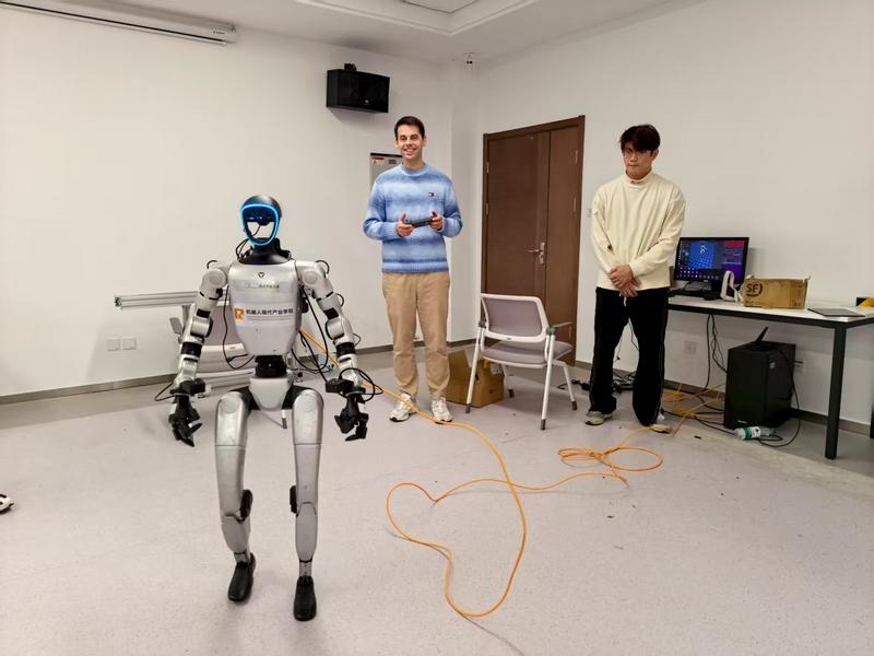近日,浙江科技大学机器人现代产业学院实验室里,来自德国德累斯顿技术经济大学的硕士研究生马克西米利安·穆勒正在与开展他关于宇树人形机器人的毕业论文研究。