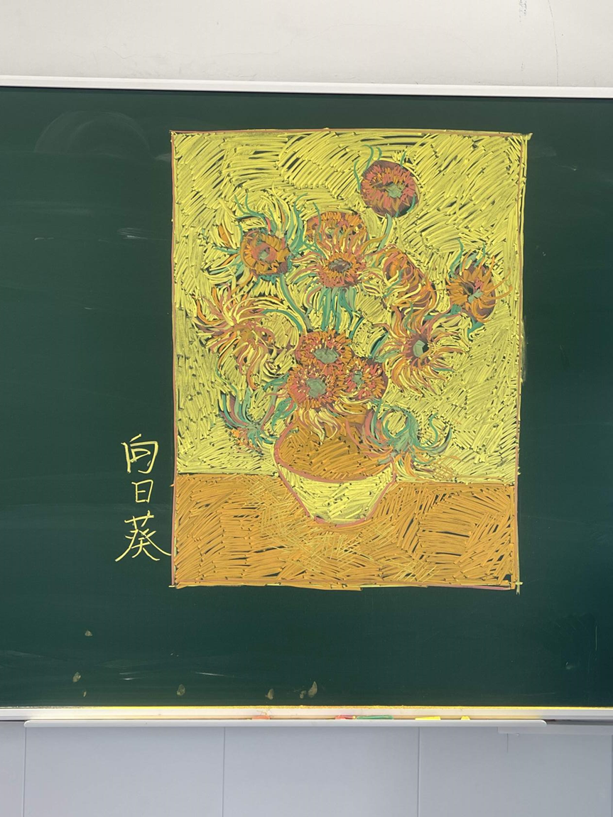 “画梵高的向日葵,是因为正好上到了六下美术的第一课《外国的传世名作》。”张明江一边用粉笔勾勒着花瓣,一边向记者解释,“我就想着在黑板上直接呈现一下。虽然粉笔画和油画的作画工具不一样,但用笔还是有一定相似之处的。”