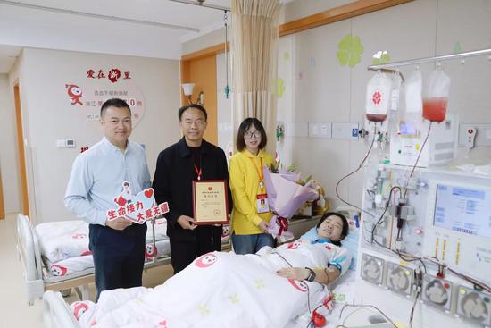3月17日,在杭州某造血干细胞采集室,经过4个多小时的采集,杭州市民孙银凤成功捐献163毫升造血干细胞混悬液,成为浙江省第1370例、杭州市第430例造血干细胞捐献者。