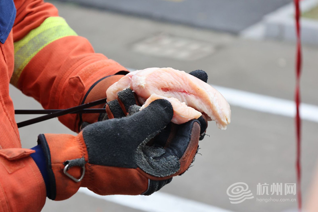 测试结果触目惊心:黄瓜、胡萝卜接触风筝线的瞬间,便被直接斩断,切面平整光滑,如同被刀具精准切割;鸡胸肉则被瞬间割下一大块,消防员后续将鸡胸肉在风筝线上轻缓来回滑动,一次便留下0.5厘米深的割痕,反复滑动后割痕最深达2-3厘米,直观展现出风筝线的切割威力。