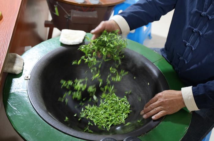 最近连日阴雨,给制茶增加了难度。“我们尽量不采雨水叶,它含水量高,处理不好香味会淡。但茶芽长到了2.5-3cm的标准就必须要摘下,这时候就考验我们的‘手上功夫’了。”黄祖华说,他一方面会在摊青环节多花时间,让水分充分蒸发;另一方面炒制时温度会稍高一点,把茶叶做干做透,水分控制在4%以内,这样才能更好保证茶叶的品质和香气。