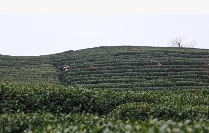 一盏茶香,一饮入春,上城埭村茶园里蛰伏一冬的茶树已吐露新芽。身着雨衣、雨裤、雨靴的采茶工正与时间赛跑,弯腰俯身于绿意盎然的茶树间,手指在茶蓬上翻飞,将一簇簇鲜嫩的“两叶一芽”收入篓中。
