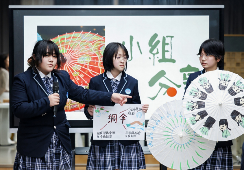 西湖绸伞不仅是遮风挡雨的工具,更是烟雨江南的文化符号,是凝聚着匠心与精神的美育载体。余佩融带着学生在感知美、理解美、认同美的过程中,完成文化自信的深层建构。在巧思融韵环节,学生们分组讨论如何用他们热爱的动漫创意为非遗赋能。面对传承人的邀约,学生们展开头脑风暴,从IP设计到短视频创作,一个个充满专业特色的传承构想跃然眼前。这些创意实践,是学生将内在审美素养外化为创造力的生动体现,也是“完善面向人人的常态化学校艺术展演机制”在课堂中的前置与延伸。