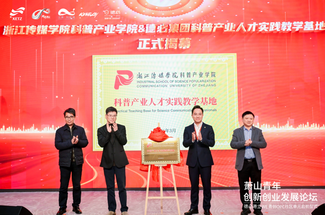 活动现场,政企校社多方聚力赋能,一系列重磅合作与举措同步落地,构建萧山青年创新创业的赋能矩阵。浙江传媒学院科普产业人才实践教学基地在德必港立WE正式揭牌,校地双方深化产教融合、协同育人,打通“高校育才—基地实践—产业转化”全链条,为人工智能、数字传媒、科普创新等领域培育高素质青年人才,夯实区域创新发展人才培育;“致公之家”授牌仪式同步开展,依托致公党侨海特色链接海内外资源,为青创事业注入全球化动能,助力企业跨境出海。