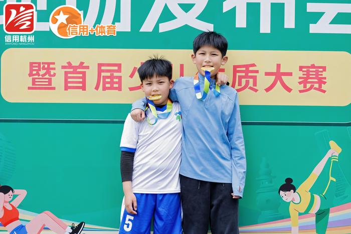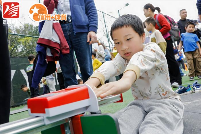 作为活动的重头戏,“信动未来”青少年体质挑战赛吸引了全市150组家庭踊跃参与。这场面向6-11岁少儿的赛事,不仅是一场体能的比拼,更是一次生动的信用教育实践。赛场上,小选手们依次完成了30秒跳绳、50米往返跑、仰卧起坐、十字象限跳和坐位体前屈5个项目的测试。值得一提的是,本次赛事的报名通道优先向“钱江分”达标的家庭开放,并在比赛过程中穿插了信用知识问答环节。所有完赛的小选手都获得了定制奖牌和证书,优胜者还收获了由信用体育合作机构提供的“信用激励大礼包”。