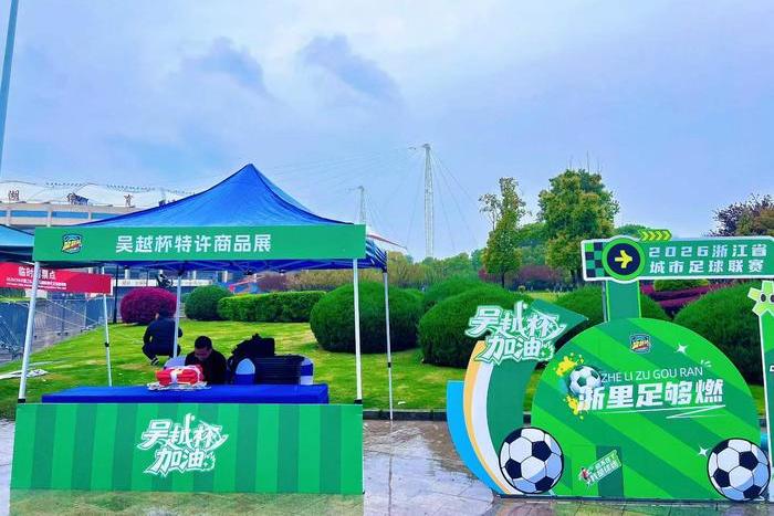 吴越杯特许商品展里,臻元箱包以及义乌文旅展出的十余款足球主题文创产品集中亮相。徽章、冰箱贴……品类不算多,但每一款都紧扣赛事主题。臻元箱包现场负责人介绍说:“这次带来的文创产品主打实用性和收藏价值,像徽章和冰箱贴这类小物件最受年轻球迷欢迎。”一旁的拍照手举牌同样吸引了不少目光——文案根据全省11个地市分别设计:“杭城逐梦绿茵争锋”“宁波亮剑一往无前”“秀山丽水足下生辉”……现场不少球迷专门找到自己家乡的手举牌合影留念,说是要发微信朋友圈“为家乡打call”。