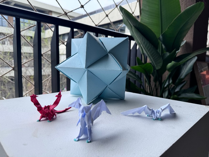没有老师教,家人也不懂,他就自己琢磨。在网上搜“折纸龙”“折纸蝎子”的视频,跟着一步一步折。他还总结出一个判断难度的法子:看视频长短。先折那种几分钟的简单款,再慢慢挑战三四十分钟的复杂款。
