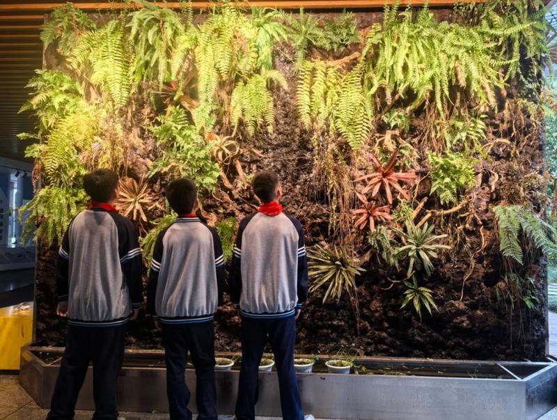 水从顶部蜿蜒而下,浸润过层层苔藓,汇入底部水池。积水凤梨的叶片像向上张开的手掌,接着水滴,也接着窗外的阳光。孩子们路过时,总会停下来,伸手接一滴水,或者蹲下身,看孔雀鱼追逐孑孓。