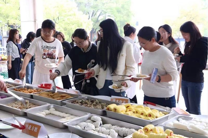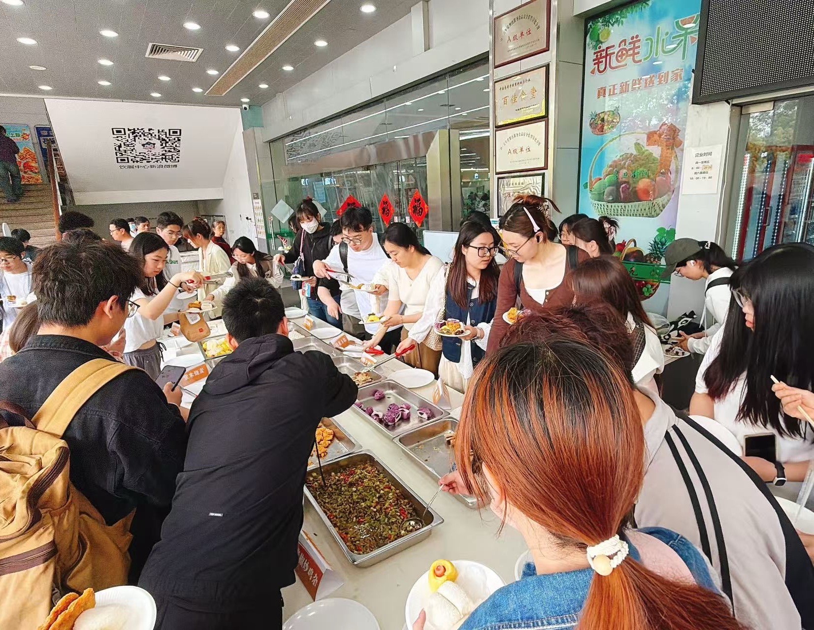 活动现场,港式椰丝包、紫米烧卖、小米椒鸡杂、香酥带鱼等数十种特色菜品整齐陈列,涵盖早餐、中餐特色菜等品类,色泽鲜亮、香气扑鼻。师生们有序取餐、边吃边交流,不时提出试吃感受,欢声笑语不断,整个食堂充满了温暖的烟火气息。
