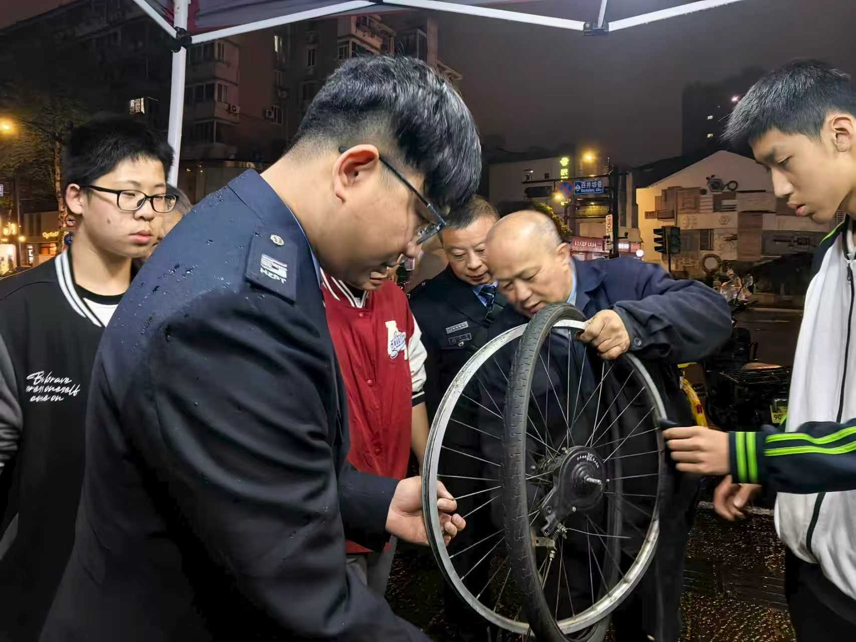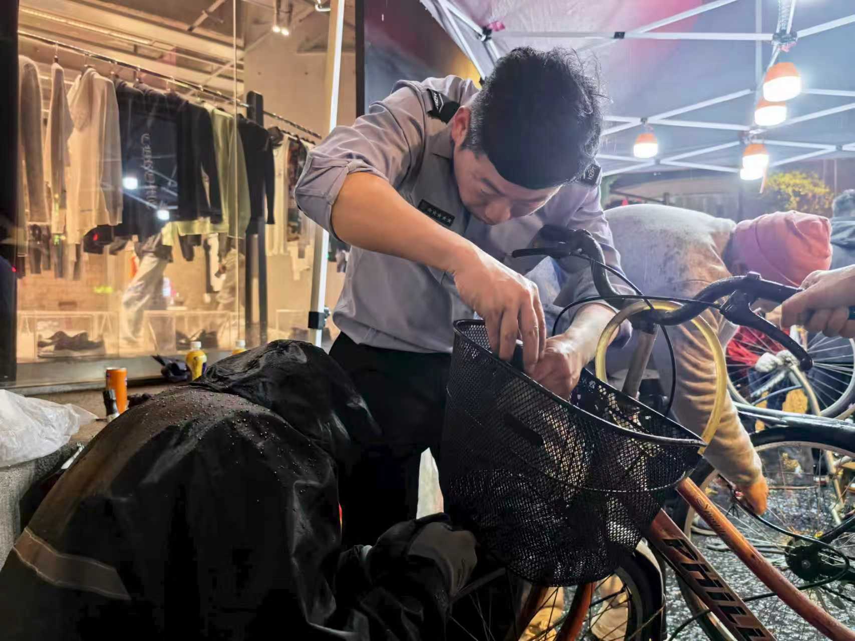 在义务修车点位前,推着故障自行车前来求助的市民络绎不绝。孔胜东熟练操持着扳手、螺丝刀等维修工具,对车辆故障逐一排查、精细调试,小到拧紧螺丝、修补车胎、调试刹车,大到整车零配件更换,每一个操作环节都一丝不苟、精益求精。身旁的青年骨干们同步配合,协助接待市民、传递维修工具、对接服务需求,同时向市民讲解自行车日常养护技巧、雨天安全骑行注意事项,在实操中传承孔胜东数十年如一日的奉献精神,用贴心、细心、耐心的服务回应市民诉求。