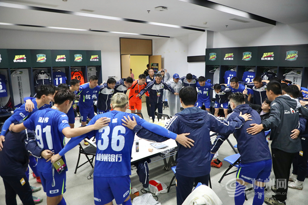 雨战前夕,杭州队将士众志成城,在更衣室围成一圈、凝聚一心