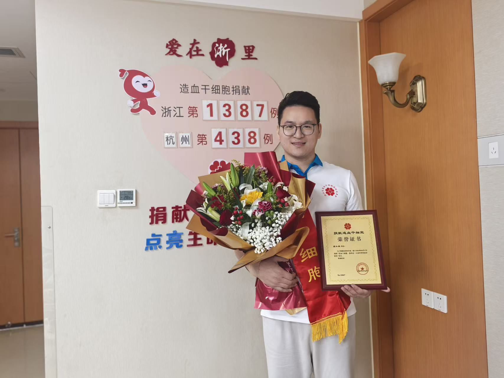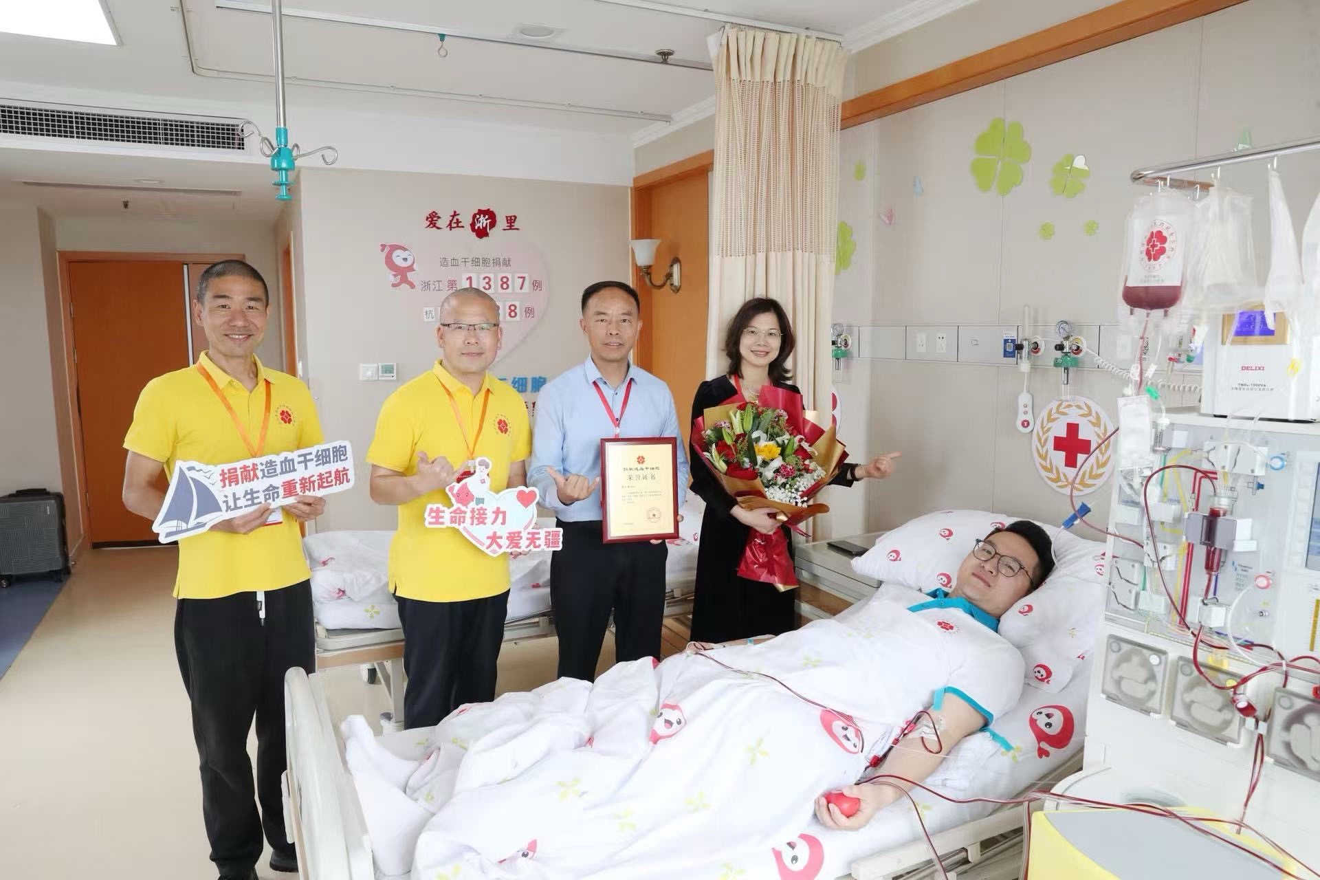 4月17日,在杭州某造血干细胞定点采集医院,杭州小伙裘弘昊成功捐献270毫升造血干细胞混悬液,成为浙江省第1387例、杭州市第438例造血干细胞捐献者。