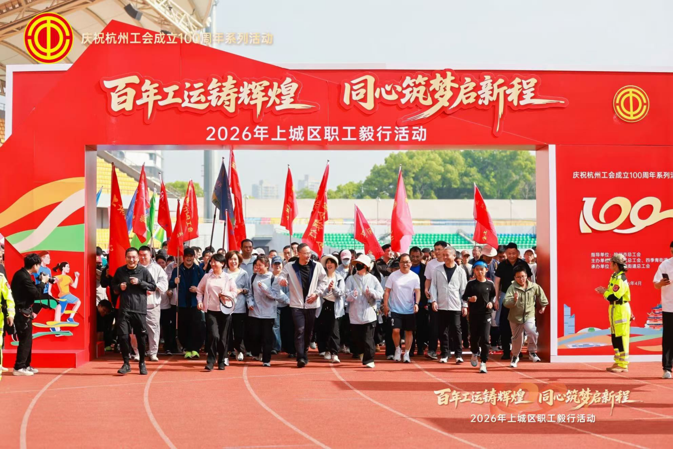春光明媚好,奋进正当时。为庆祝杭州工会成立100周年,积极响应“体重管理年”行动号召,倡导职工健康生活,4月19日,由上城区总工会、四季青街道主办,四季青街道总工会承办的2026年上城区职工毅行活动在上城区体育中心田径场拉开序幕,近500名来自各行各业的职工代表迎着春风迈开步伐,用坚实的脚步致敬百年工运。