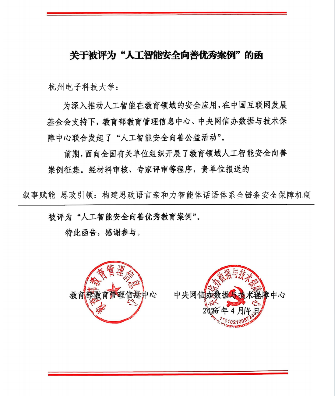 近日,教育部教育管理信息中心、中央网信办数据与技术保障中心联合发布“人工智能安全向善公益活动”的评审结果,杭州电子科技大学报送的《叙事赋能思政引领:构建思政语言亲和力智能体话语体系全链条安全保障机制》成功入选“人工智能安全向善优秀教育案例”。
