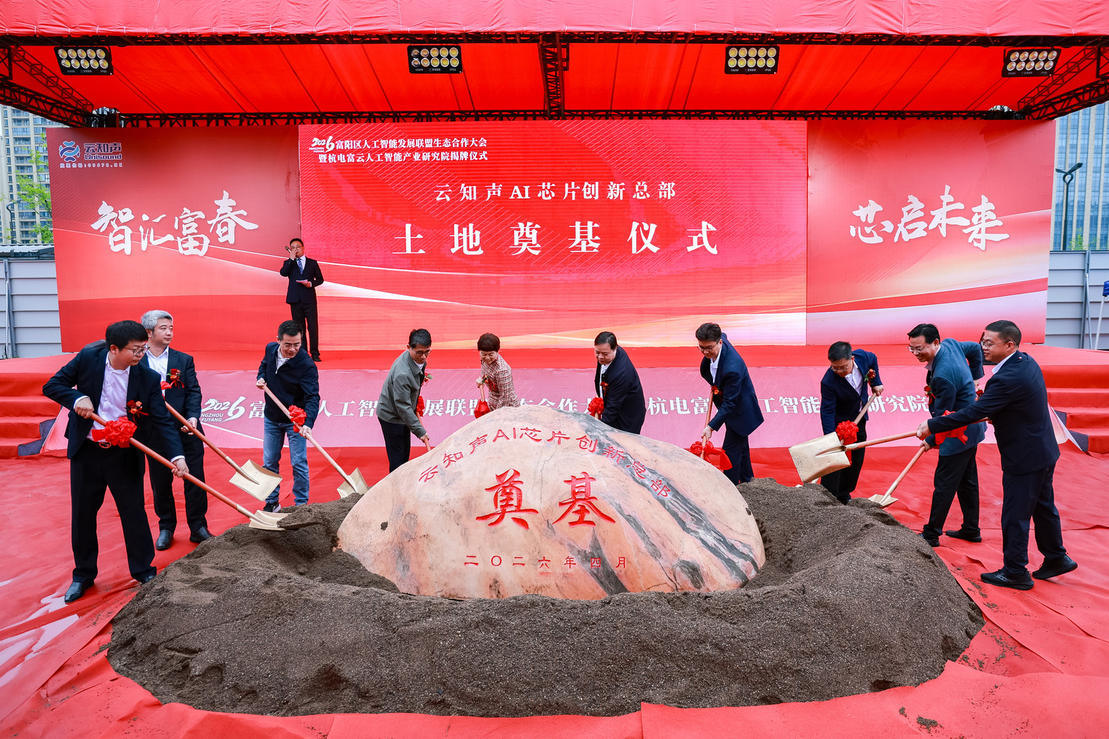 当日,云知声AI芯片创新总部项目正式奠基。该项目位于杭州富春湾新城春南产业园,占地面积约1.1万平方米,总建筑面积约4.8万平方米,将建设集AI语音芯片模组研发、智能终端制造、行业方案孵化于一体的综合性创新基地。项目承载着云知声“芯模协同”的核心战略,通过自研芯片与原生大模型的深度融合,实现从技术到应用的闭环。