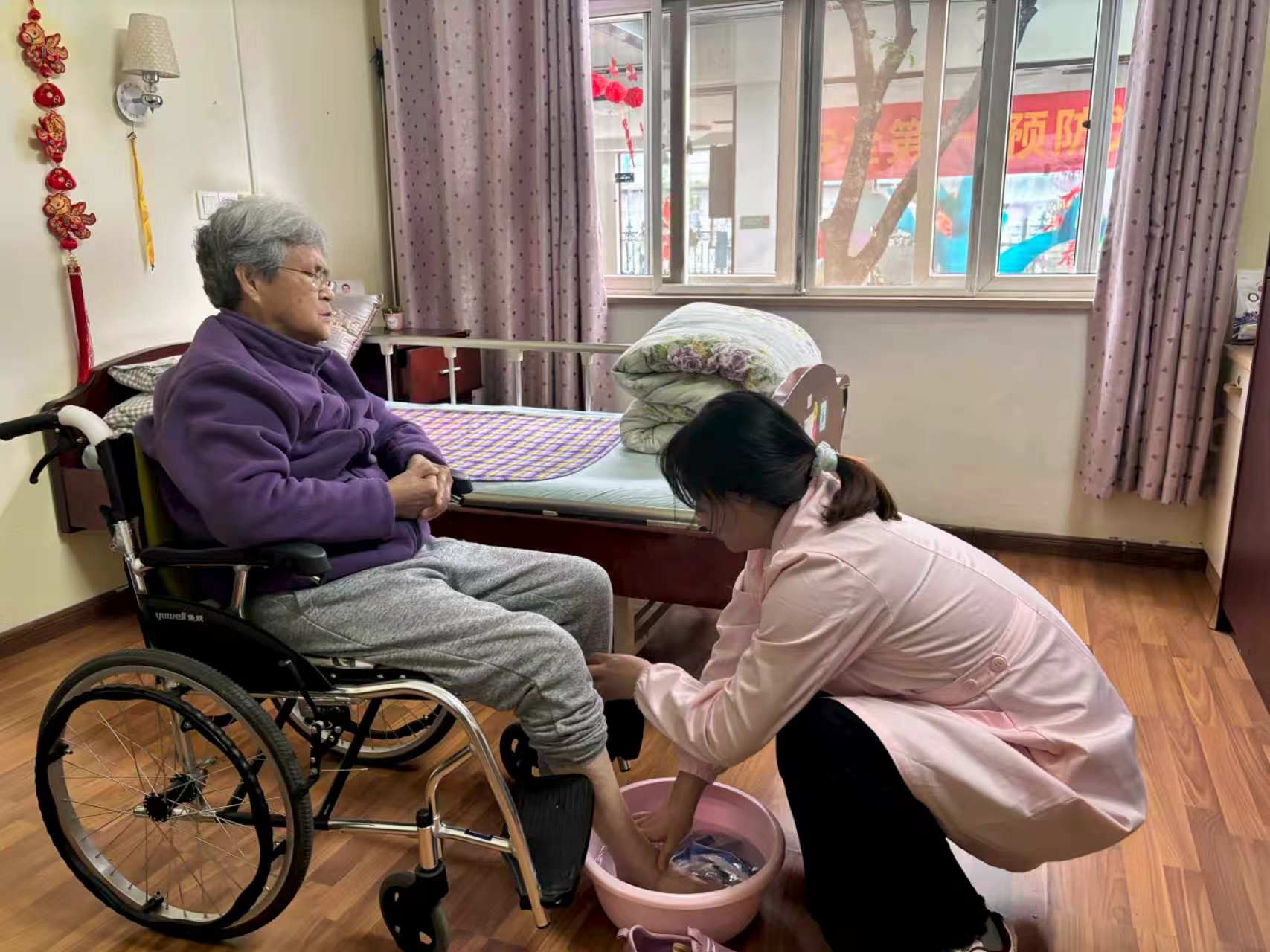 她每天早上为老人洗脸、擦身、喂药、做康复训练,夜里每两小时观察一次。“让老人有尊严、快乐地活在世上是我的初心。”