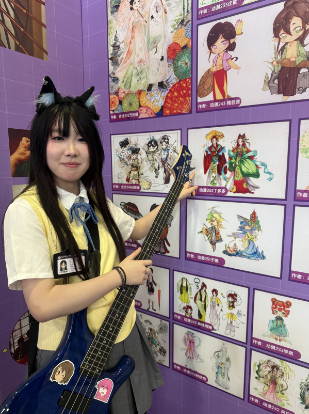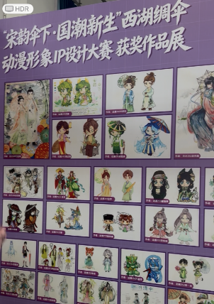 “哇,这不是我的作品吗?”一名拿着贝司的女生路过西湖绸伞动漫形象IP设计大赛的获奖作品展板前,惊喜地喊出了声。