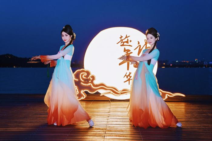 夜游沿途安排了多场实景演出。《西湖东坡》驻场秀再度归来,情景杂技《人间至味》震撼开场,《过溪亭送别》高燃复刻,丝竹歌舞《苏堤春晓》绘出诗画长卷;我心相印亭处,舟女献曲《出水莲》,琴歌《水调歌头》婉转低回,诗词吟诵与丝竹琴歌交织,令东坡笔墨风骨触手可及。