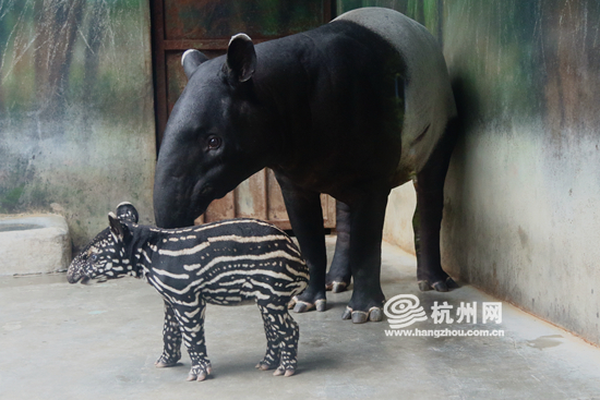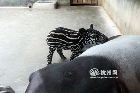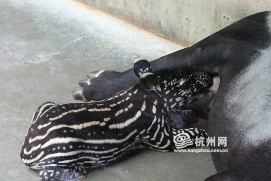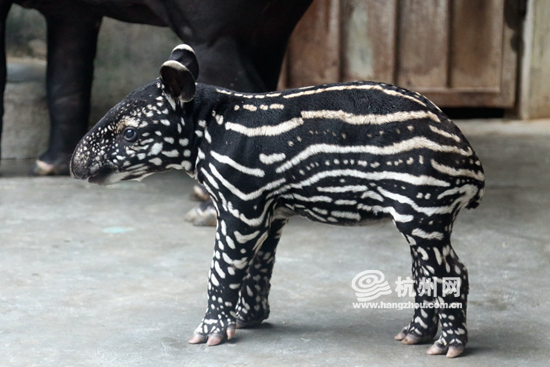 这位在杭州野生动物世界出生的“貘公主”,自带一身小西瓜般的美丽花纹。据饲养员丁富国介绍,“这身花纹会在2个月后开始慢慢转变,不到6个月‘花俏童装’就会换成一身黑白成人晚礼服。”提起貘公主的平安诞生过程,饲养员丁富国依然很兴奋。