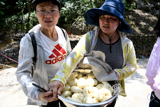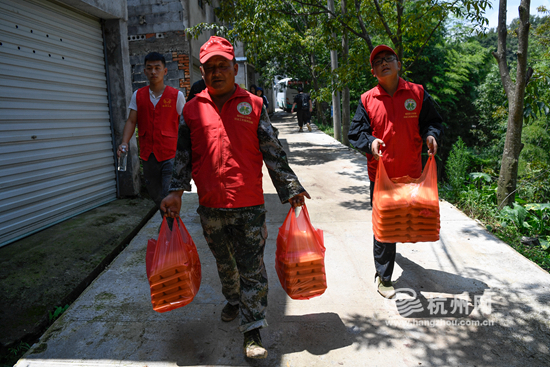 这两天,来自临安的志愿者们,从凌晨三点就开始为受灾村民做包子。时近中午,近千只热腾腾的肉包被一盆一盆地送进上许村里。