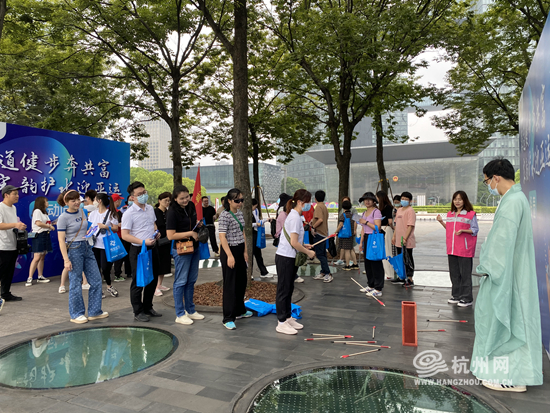 活动在健步路段中精心设置4处通关卡口,每个卡口设定了不同的挑战,完成即可获得一个盖章。其中第一道知识问答关卡中,设置了五水共治、垃圾分类、亚运主题等题目,答对即可盖章。第二、三个关卡分别是投壶、蹴鞠这两项充满宋韵特色的体育运动,第四关则是与宋代人物合影打卡。参与嘉宾只要通过4个关卡、集齐4个章便能返回起点兑换纪念品。