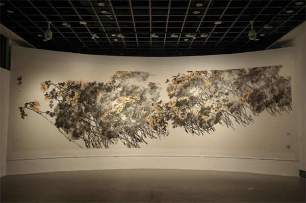 第一部分“葵园桑海”,一进入展厅,即有一幅11米宽的巨幅写意葵花印入眼帘,花干迎风,花盘向阳,这是以写风中之葵来探索花鸟画的时代风格。