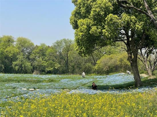 春半日暖,西溪绿意盈盈,各色春花点缀其间,正是一年好风景。洪园火柿路饱满的木绣球、园区各处缤纷浪漫的樱花、绿堤瀑布般的紫藤、随处可见的二月兰、绿堤大草坪烂漫的彩色油菜花海、主航道沿线的油菜花……共同将西溪打扮得明媚俏丽,虾龙滩的幌菊花海更是以一片梦幻蓝牢牢俘获了游人的心。幌菊也叫喜林草,花瓣蓝白相间,色彩纯净,有“婴儿的蓝眼睛”之称。虾龙滩共种植幌菊5000平方米,目前已渐入佳境,随手一拍就很出片。