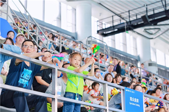 像足球赛、篮球赛一样,观众的欢呼加油声能给运动员们以鼓舞。为了营造浓厚的赛场氛围,黄龙游跳馆专门为观众准备了加油道具——拍手器,上面还贴有一张二维码,扫码可以看到电子版水球比赛宣传册,涵盖了水球科普、交通方式、赛程安排等内容,“云服务”让“绿色亚运”理念嵌入观众服务、场馆运营的过程中。