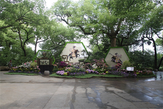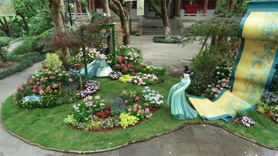 本次花展中的几组园林小品,通过巧妙的园林技艺将亚运精神、古代体育活动融入进去,颇有意趣。
