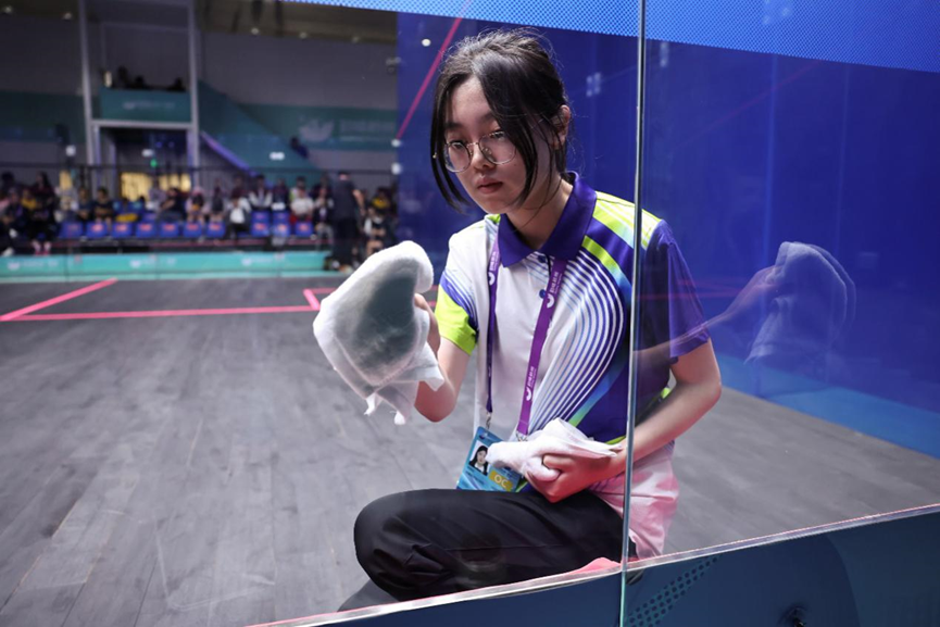 场馆不仅美观,在服务细节上也很到位。记者发现,每局比赛间隙,场馆志愿者会抓紧时间清洁比赛地板,以防运动员踩到汗水滴落的区域而滑倒。同时,他们也会擦拭玻璃墙内侧,那是因为很多选手在比赛时会顺手在玻璃上擦汗,及时清理汗渍能确保球在撞击后保持原有的运动轨迹,保障比赛顺利进行。此外,志愿者在比赛时会举着“请文明观赛”的提示牌,提醒现场观众注意观赛礼仪,以免打扰运动员正常比赛。