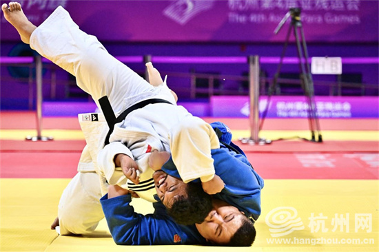 10月25日,在柔道男子+90公斤级J2 铜牌赛中,印度尼西亚选手与哈萨克斯坦选手激烈对抗。(闫雨婷 摄)