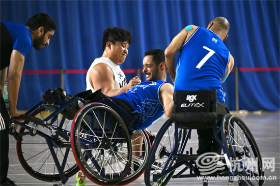 10月24日,男子轮椅篮球对抗赛中,科威特选手翻倒,双方球员合力扶起。(闫雨婷 摄)
