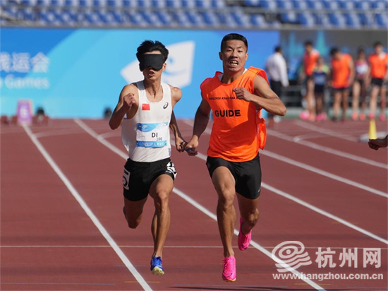 10月24日,继跳远打破亚洲纪录,邸东东又拿下杭州亚残运会男子100米—T11决赛金牌。(方建飞 摄)