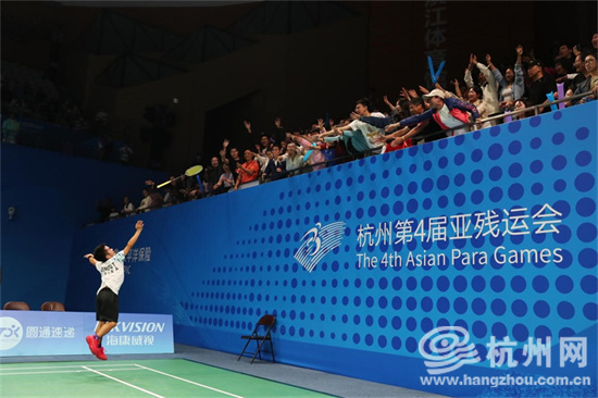 10月27日,在杭州第4届亚残运会羽毛球项目男子双打SH6级决赛中,中国组合林乃利/曾庆涛夺得冠军。图为赛后激动万分的曾庆涛把球拍送给前来加油呐喊的观众。(沈达 摄)