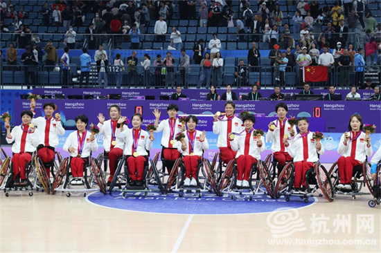 10月26日晚上,在杭州第4届亚残运会轮椅篮球项目中,中国轮椅女篮以61∶30击败日本队,拿下亚残运会“三连冠”。(沈达 摄)