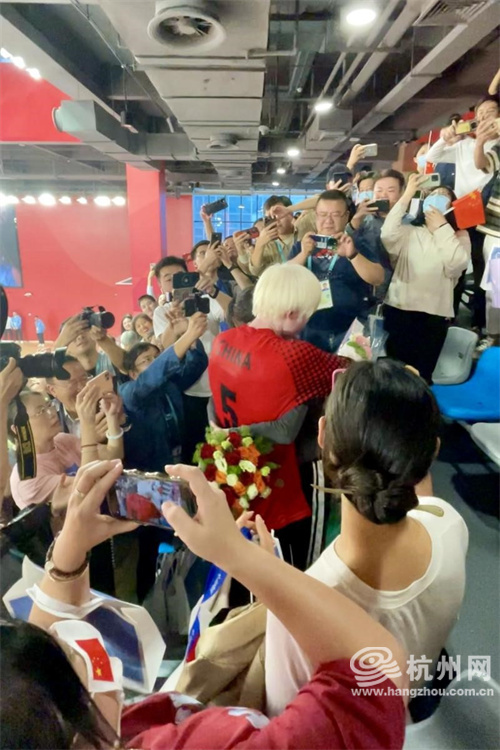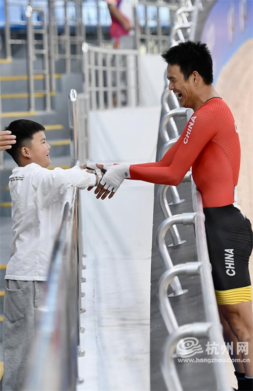 10月23日,杭州第4届亚残运会自行车混合团体 C1-5 750米竞速赛在淳安界首体育中心自行车馆举行,由来自杭州临安的李樟煜以及吴国庆、赖善章、梁伟聪、谭泽强组成的中国队以48秒001的成绩夺得金牌并打破亚残运会纪录。赛后,李樟煜穿过赛道奔向看台上的儿子。 此刻溢出来的父爱,比金牌更闪耀!(王川 摄)