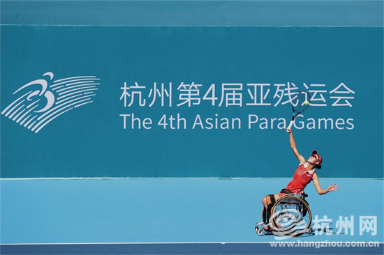 10月25日,杭州奥体中心网球中心“小莲花”里,回荡着清脆而有节奏的“砰砰”声,轮椅网球选手激战正酣。对于未来的目标,中国队女将郭珞瑶表示,毫无疑问,就是巴黎残奥会。图为郭珞瑶发球瞬间。(沈达 摄)