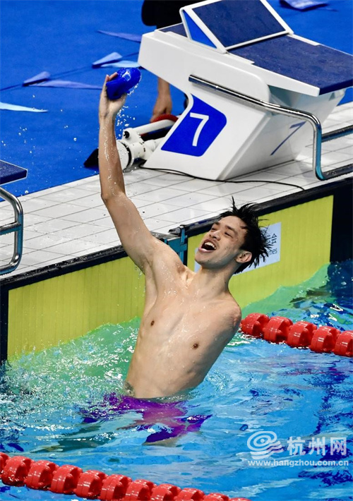 10月26日,杭州亚残运会混合4x100米混合泳接力-34分比赛中,杭州小伙子徐海蛟与队友一起以4分36秒03打破亚洲纪录并获得冠军,这是他个人本届亚残运会获得第五枚金牌。(王川 摄)