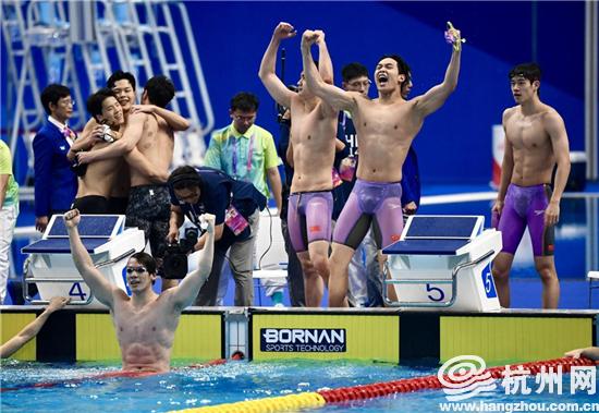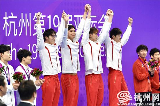 浙江小伙洪金权和队友潘展乐、陈俊儿、王浩宇组成的中国队征战男子4×100米自由泳接力决赛,最终以3分10秒88的成绩夺得金牌,破亚洲纪录。