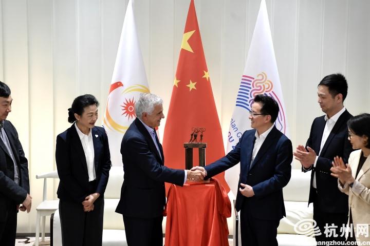 5月8日下午,国际奥委会副主席、萨马兰奇体育发展基金会创始人胡安·安东尼奥·萨马兰奇(以下简称“小萨马兰奇”)来到杭州,向杭州亚运会博物馆捐赠了“千禧门”微缩版雕塑,以祝贺博物馆顺利落成及开放。