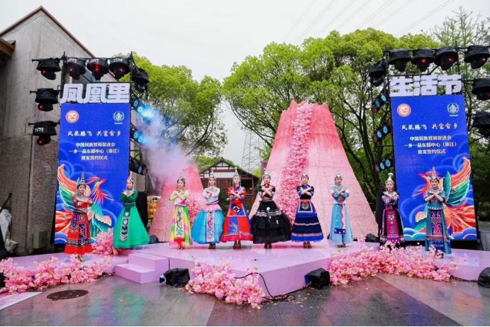 4月13日,杭州凤凰里文化园区内鼓声激昂、舞姿翩跹,凤凰里生活节子活动以“凤凰腾飞 共富畲乡”为主题的畲族非遗共富签约仪式暨中国民族贸易促进会“一乡一品”东部中心(浙江)首发活动在此盛大启幕。