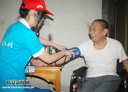 在困难老党员家中,志愿者们热心询问了解老人们的基本情况,耐心陪老人们聊天,为老人测量血压,宣传合理饮食用药知识,得到了老人们的欢迎。老党员洪顺山说:“生活在社会主义和谐大家庭中,感到很温暖,志愿者对他们关心亲如自己的子女。”