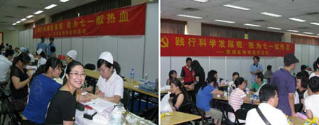 7月8日上午,西湖区委组织部、区委宣传部、区直机关党工委、区文明办、区卫生局联合举办的“践行科学发展观,我为七一献热血”活动在浙江图书馆拉开了帷幕。此次活动得到了全区上下广大党员、入党积极分子和干部群众的积极响应,总计有556人报名参加献血,为西湖区自2001年开展“我为七一献热血”活动以来报名人数最多的一次,体检合格并成功献血320人(其中双浦镇85人),献血总量达到73400毫升。