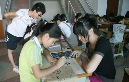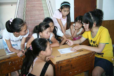得知杨村桥镇有许多父母亲在外种草莓、打工的小学生,放假了在家没人辅导,浙江林学院信息工程学院的六名大一学生,便来到杨村桥镇开展为期一周的大学生社会实践活动,关爱留守儿童的暑期生活。7月8日上午,他们借用一户农家的客厅,组织十多位留守儿童进行暑假作业辅导。
