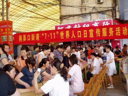 在第二十个“世界人口日”来临之际,闸弄口街道计生科在安琪儿市场开展以“关注生殖健康,促进和谐发展”为主题的大型宣传服务活动。