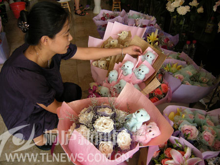 此外,记者还发现今年的花市上多了一种“娃娃花”,特别受年轻顾客的欢迎。瑶琳路上一家花店老板娘说:“这种娃娃花近几年才开始流行,因为娃娃样子可爱,而且经久不衰,特别受80后顾客的喜欢。” 图为店家精心包扎“娃娃花”。 |